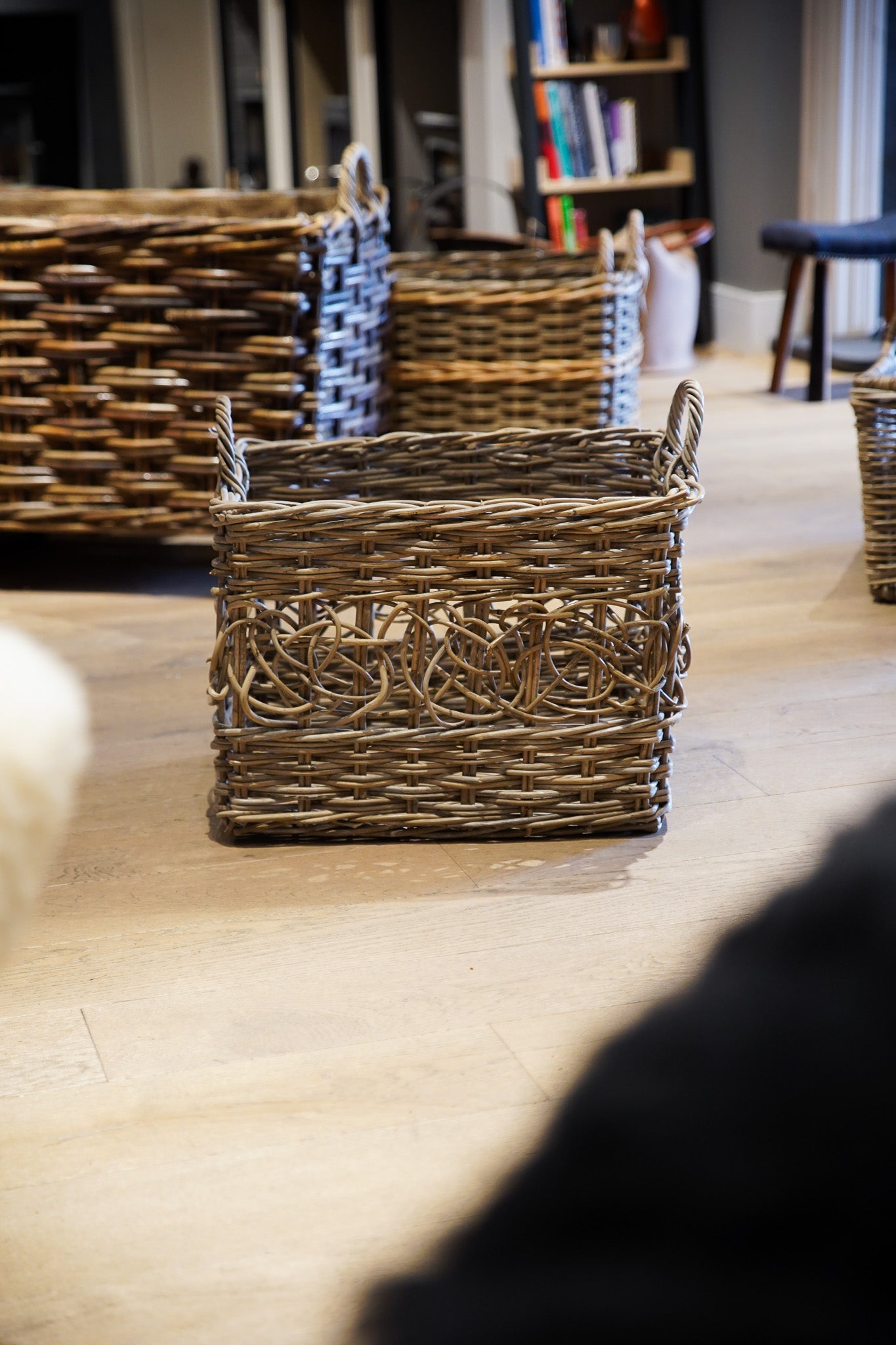 Hand-woven with a sturdy, high-quality rattan, this basket features a beautiful multi-tonal grey wash that highlights the organic texture of the weave. The low-profile "ear" handles are integrated into the frame, providing a strong grip for carrying heavy loads while maintaining a streamlined look that doesn't add unnecessary height or width.