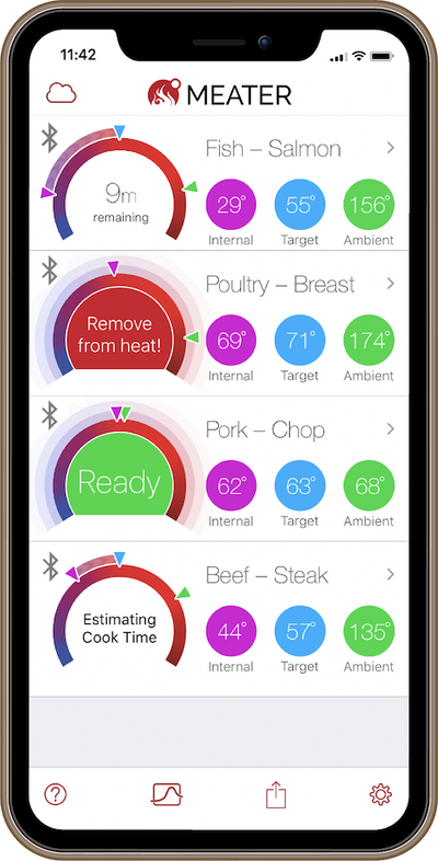 With the MEATER Plus all the stress of cooking is removed. Using an advanced estimator algorithm, the MEATER Plus allows you to relax and plan your meal without any stress, by accurately estimating how long you need to cook and rest your food. And with customised alerts and notifications direct to your device you are alerted as soon as your food is ready.