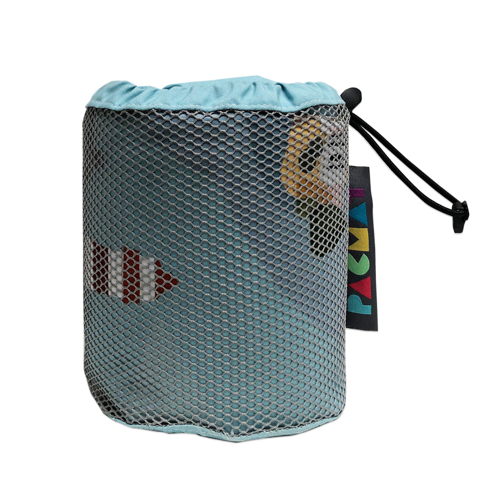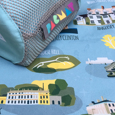 Made from recycled fabric it has an abundance of practicality. With a polyester top layer, it's soft, sheds water, is quick-drying, ready to machine wash, lightweight and won’t smell. The base is made from super light waterproof ripstop nylon which is strong, durable and packs away small.
