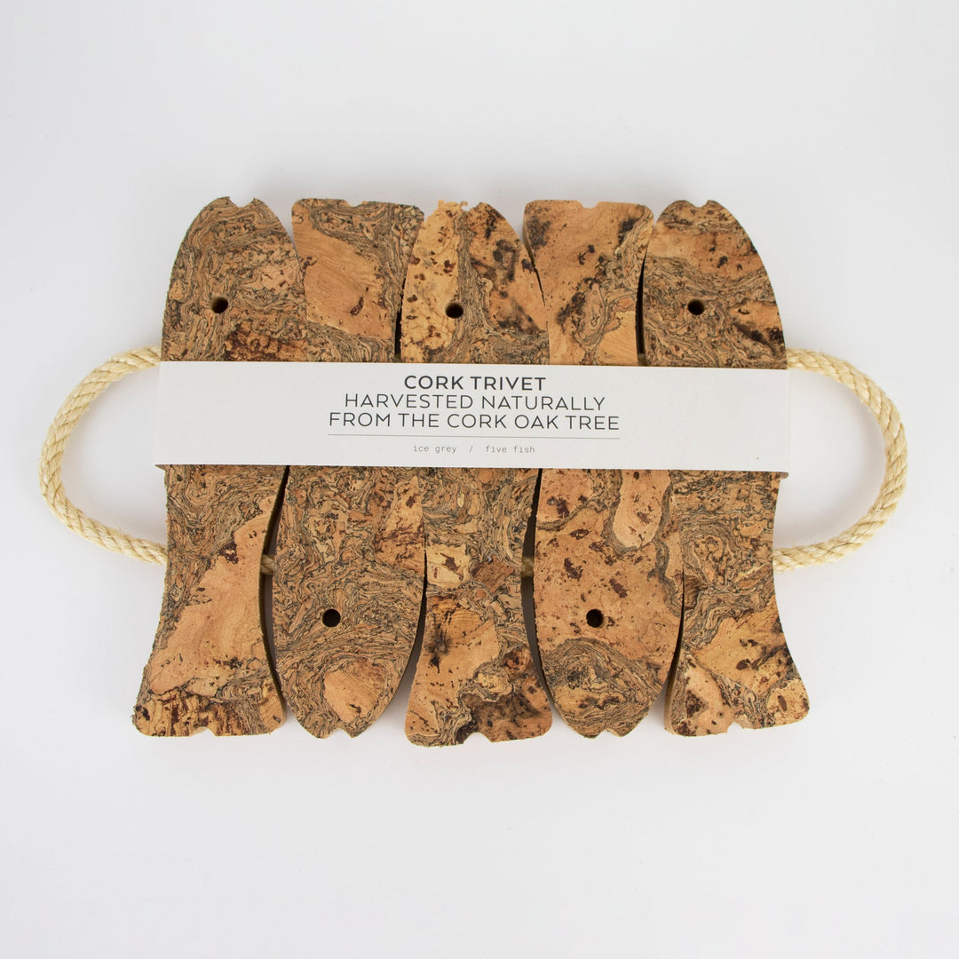 The Liga Ice Grey 5 Fish Cork Trivet is made from sustainable cork which is harvested once every nine years without felling trees.